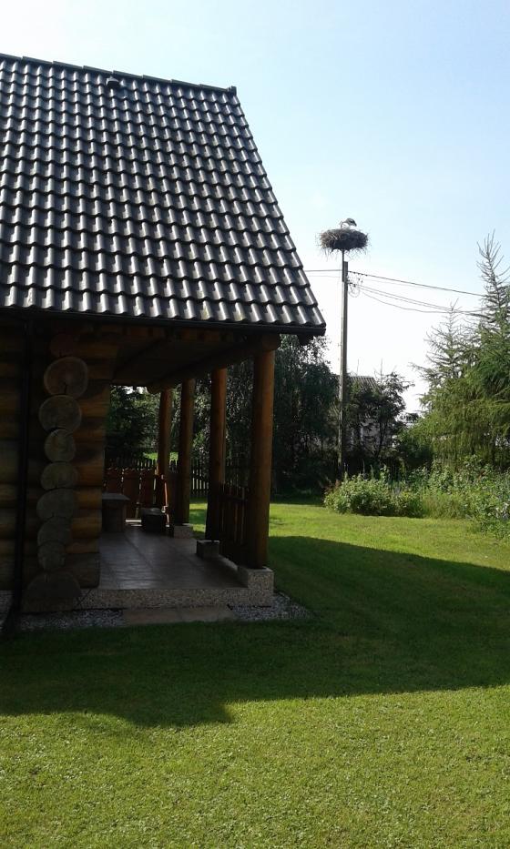 Na początku myślałem o technologii góralskiej – dom jest budowany z bali, przy budowie jest pozostawiona przestrzeń między klocami drewna, którą przedtem wypełniano tzw. warkoczem z trocin. Jest to dobre, lecz po kilkudziesięciu latach tworzą się szpary, które trzeba uzupełniać lub włożyć nowy warkocz. Postanowiłem posłużyć się technologią sprowadzoną z Kanady, gdzie bale są wycinane klinowo, a między belkami jest wkładana wełna - najlepiej naturalna. Te wycinane kliny w balach spełniają dwie role: pierwsza - belki na składaniach nie przesuwają się, druga - jak większość z nas wie, drewno „pracuje" i przy wysychaniu się kurczy - w tym czasie belki mogą się „bardziej złączyć" likwidując ewentualne luki. Z tego też względu po pięciu latach wysokość pomieszczeń, w moim przypadku (sufit z podłogą), zmniejszyła się o 13 cm. Dlatego też trzeba pamiętać o większej wysokości na początku budowy. Teraz już budynek się ustabilizował. W środku pomieszczenia ewentualne niedoróbki belek zakryłem prostym wiejskim sznurem, co myślę przyozdobiło też wnętrze. Drewno jest niezwykłym materiałem, przy większej wilgotności powietrza wchłania wodę, a przy powietrzu bardziej suchym - oddaje. Wchodząc do pomieszczenia (mieszkając) mamy wspaniały mikroklimat, przesycony pachnącą żywicą. W „chatce" tej zainstalowałem centralne ogrzewanie, lecz w razie awarii lub wyłączenia prądu mam kominek, z którego ciepło jest rozprowadzane po pomieszczeniach. Już po roku czasu po postawieniu „chatki" obok, na słupie, osiedliły się bociany. Jesienne i zimowe wieczory wraz z towarzyszką życia, w takiej atmosferze, są niezapomniane.